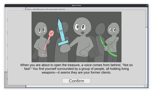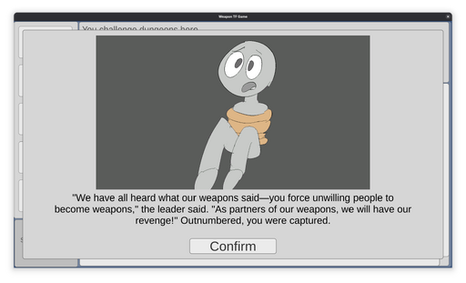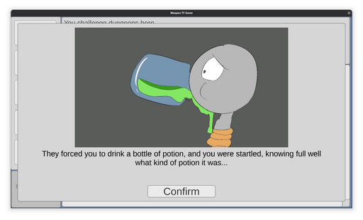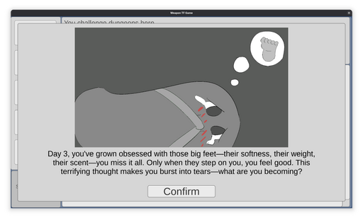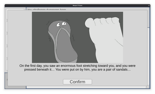 Just as the Protagonist was about to obtain the treasure at the end of the Inferno, they were cornered by other adventurers, which had heard stories of the Protagonist's evil deeds -- transforming unwilling people into weapons and selling them. They captured the Protagonist, and forced them to drink a Sandals Potion, which turns them into Sandals. Over the next few days, the Protagonist's mind slowly breaks, as he starts loving his master's foot.